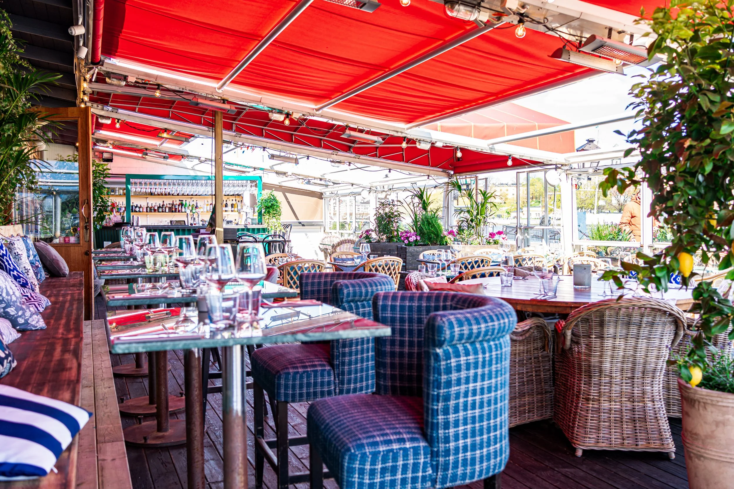 Uteserveringen kommer under höst och vintern att vara öppen och kommer att förvandlas till en vinterträdgård med alla träd och växter och andas Medelhav Med värmare och fläktar som kommer att