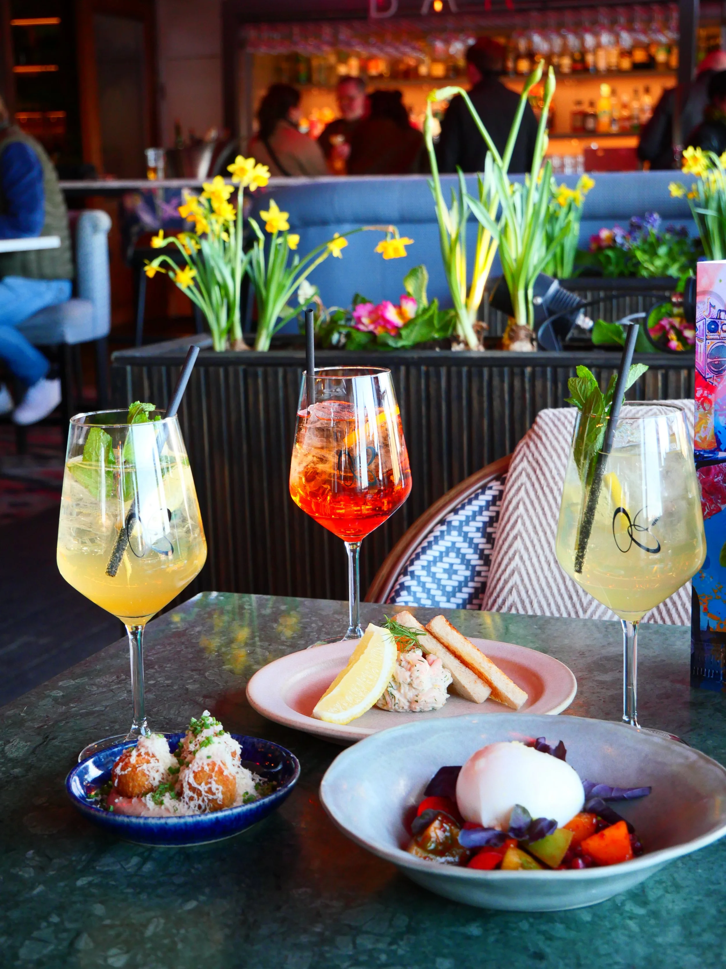 Karamell har baren, en utomhus under markis och värmare, en stor bardel på kortsidan med plats för 60 sittandes samt lika många stående. samt en liten bar i matsalen